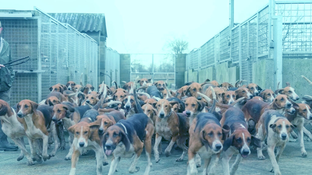 Barbaro after the Hunt is a video installation composed of three screens mounted on steel structures with bronze feet. It is inspired by the eponymous work of Rosa Bonheur, a nineteenth-century animal painter, in which the melancholic gaze of a hunting dog unsettles the traditional image of the predator. Conceived as a moving triptych, the installation creates a frontal and immediate connection with passersby. It builds on the imaginary of the hunting dog, a loyal animal, instrument of domination, masculinist totem, to generate a tension between an assumed instinct for predation and the possibility of a shared vulnerability. Filmed in Ille-et-Vilaine in an isolated kennel, a pack of predators stands at attention, waiting under an invisible constraint. The film combines real footage in slow motion with ethereal color grading to embody a polymorphous body that reminds of the “survival of the fittest.” Evoking both Cerberus and the Lernaean Hydra, the pack, at times comic, at times unsettling, stares at the camera for an extended moment before lunging toward an invisible target, invoking a collective re-reading of contemporary masculinities. In this frontal composition, the gaze is no longer unilateral; it is returned, even reversed. The window becomes, in turn, a mirror and a screen for our social hierarchies. This project seeks to reclaim language and symbols, to nuance binary oppositions, and to open doors toward understanding the mechanisms that could guide us to a less competitive and more empathetic social script, to comprehend where predators are fragile, and where companion species are strong.