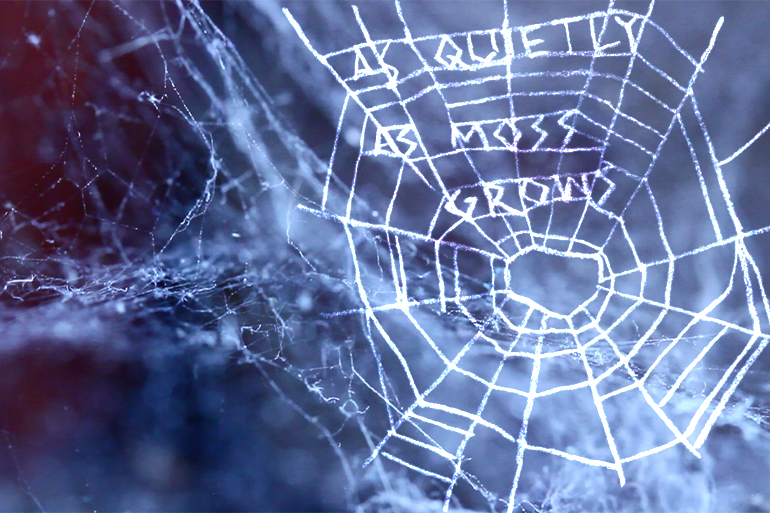 “She had noticed that in recent days the spiderwebs had been growing larger and denser, seeming to completely take over the abandoned shops and offices. She heard a noise, a crunch of a leaf behind her, and quickly darted around, startled. As she did so her torch briefly flashed into a nearby window, illuminating the thin, silky lines of a spiderweb. She turned back, shining the light carefully across the lines from left to right, as if reading a book. And within the path of light she deciphered the words ‘as quietly as moss grows’ spelled out with spidery precision.”