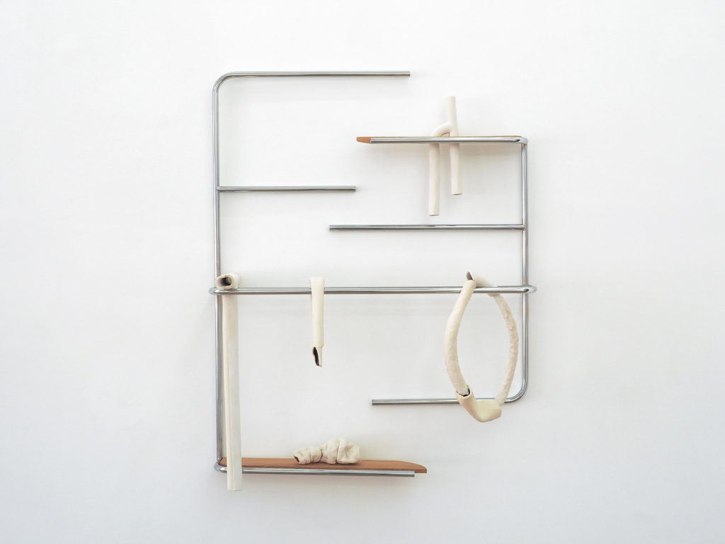 In Industrial-visceral, the artist shows a new series of sculptural arrangements in which she combines common materials – such as chrome tubing and wooden boards – with household items – such as trays, cups and vases. The resulting artworks are left in a state of limbo between construction and deconstruction, suggesting both presence and absence. While they nod to domestic furniture, such as bookcases or clothes rails, the artist’s sculptures are also evocative of museum contexts, as they adopt an ambiguous role between artworks on display and systems of presentation. Ikenaga resonates with Gaston Bachelard’s phenomenological exploration of the house in Poetics of Space (1958) and reveals the domestic sphere as a site of visible and hidden experience, intellect and emotion, presence and memory.