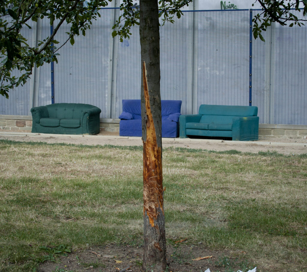 Paint-splattered panels from the studio recall the successive artworks that were produced there[2]. Additionally, sofas from a communal lounge evoke the concept of an open and collaborative approach to psychotherapy. Sound recordings recount episodes from this environment, serving as archives of interconnected personal stories. These narratives are also translated graphically into large-scale drawings, revealing a constellation of places and people, a network and a territory. The arrows, deliberately left undefined, symbolize the relationships between individuals. They are the threads of the story, weaving the fabric of its unfolding. This system highlights the impulses and flows that initiate events. The density and complexity of the outline lends them a certain illegibility. The intimate is here revealed less through form than through concept. Meaning arises from the collective nature of the artwork, unified by a shared graphic language. The “Sociogenogram[3]” is used here for its expressive artistic potential: as a sketch captured on the fly, it paradoxically conveys the complexity of the situations experienced by service users and members of the psychosocial support network. The window literally reflects a kind of disorder. More importantly, it conveys the multiplicity of forces at play. It will be periodically activated by the collective during shared sessions.