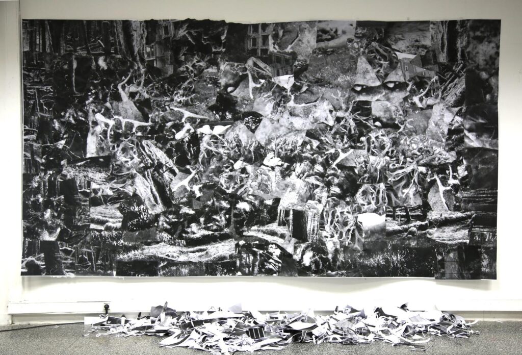 The artist creates panoramas stitched from scattered pieces, like a nebula stretching endlessly outward. In her work, space is never enclosed and invites continuity. What’s absent holds as much weight as what’s shown. A subtle reorganization of our world takes shape through the accumulation of scraps, vivid testaments to our fragmented and disjointed environment. Multiplicity, in the sense of copy, leads to a transfiguration of visual language, like solitary waves intersecting and overlapping. There’s something invasive at play here, like contested territories in flux. Looking at Julia Kremer’s work, one might imagine a ravaged landscape strewn with rubble.