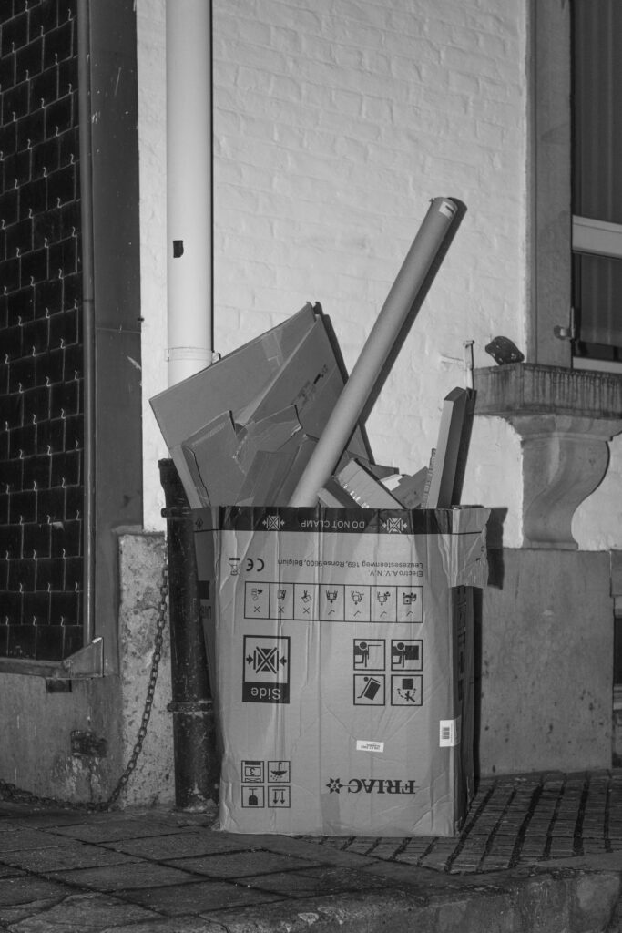 Ce langage silencieux n’existe que quelques heures. Les cartons sortis tard disparaissent au petit matin, avalés par le camion poubelle avant que la ville ne s’éveille. C’est là tout l’enjeu de cette série : fixer ce que peu de gens remarquent, ce qui existe dans un entre-deux, un instant furtif où la ville dort encore. Les photographier, c’est donner une présence à ce qui disparaît avant même d’être remarqué.
