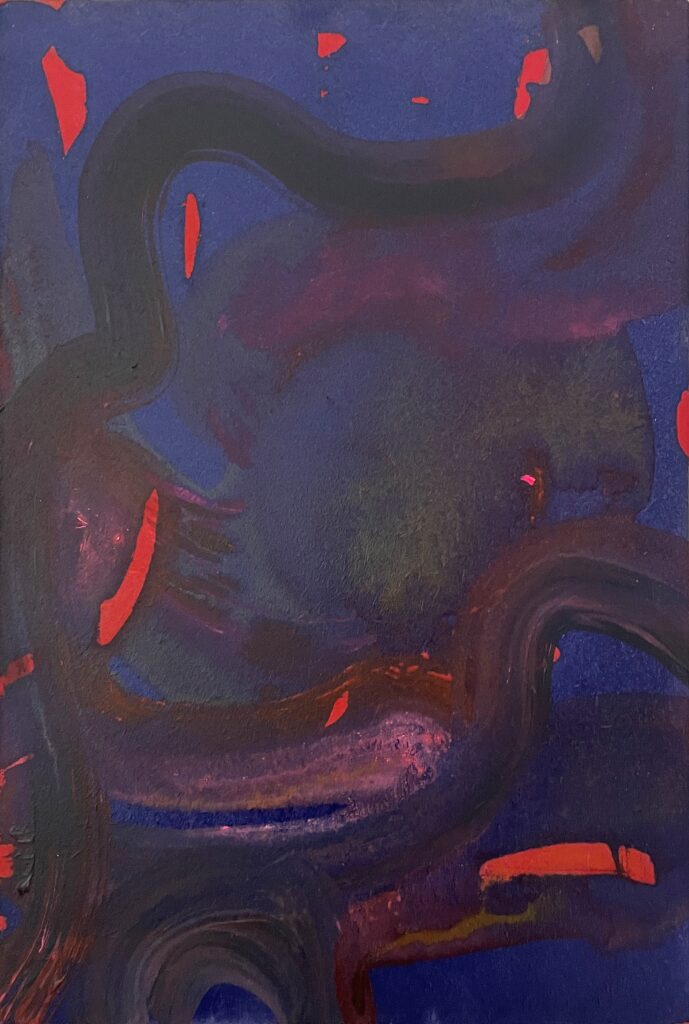 La nuit, l’oeil et l’ouïe peignent leur propre paysage : dans des teintes bleues, roses et violettes. Bettina Marx capture ces paysages. Sur tissus, papier et bois. Des matériaux qui forment des volumes, mais qui sont néanmoins mobiles. En tant que peintre, elle se déplace en premier lieu sur une surface, une surface sur laquelle elle empile des éléments minuscules. Elle peint des détails abstraits qui se densifient, remplissent ainsi toute la surface. Elle découvre ces fragments dans le paysage nocturne qui l’entoure et les transporte dans l’espace à travers lequel les observateur.ices se déplacent. À partir d’éléments abstraits et de détails en surface, une végétation autonome se développe, un fourré de structures se forme.