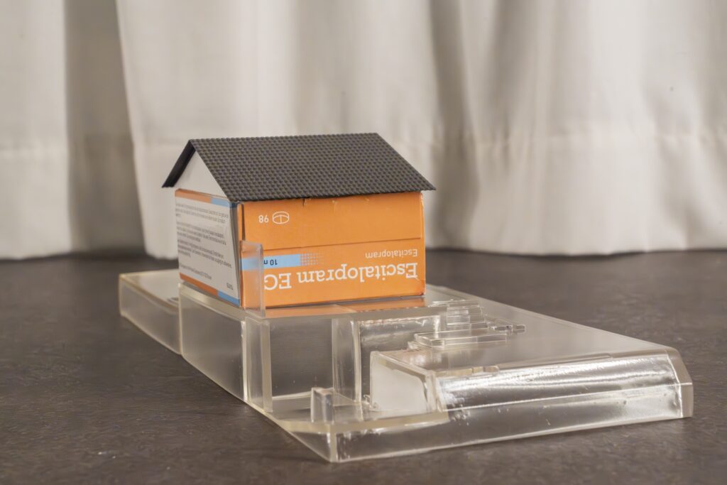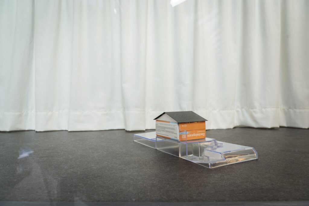 my belongings présente une maquette en résine transparente imprimée en 3D de la reconstitution par Celine Aernoudt de sa maison parentale et de son jardin. La maison est représentée par une boîte d’antidépresseurs en carton, une façon pour l’artiste de soulever des questions d’héritage et de patrimoine, de généalo- gie et d’éducation, d’accumulation et de perte.
