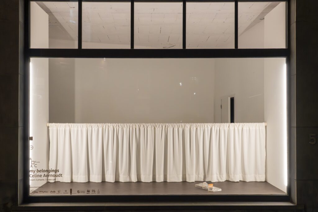my belongings présente une maquette en résine transparente imprimée en 3D de la reconstitution par Celine Aernoudt de sa maison parentale et de son jardin. La maison est représentée par une boîte d’antidépresseurs en carton, une façon pour l’artiste de soulever des questions d’héritage et de patrimoine, de généalo- gie et d’éducation, d’accumulation et de perte.