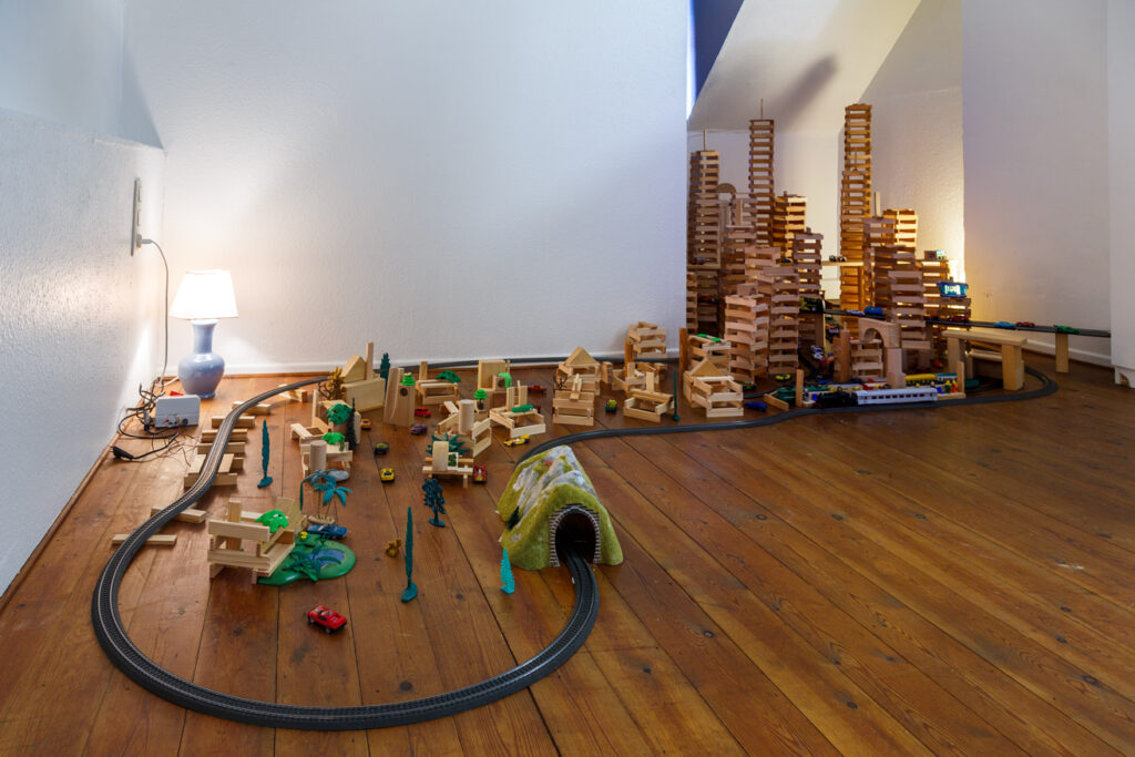Après avoir exploré le deuil, les non-dits et les héritages transgénérationnels, il se tourne cette fois vers l’enfance. Il développe un récit constitué de sons et d’images posant la question de comment faire mot autrement ? Que précède ou dépasse le langage ? Rue Monrose, 62 : La chambre L’enfant Le train, s’inspire de son premier lieu d’habitation. Il interroge, à partir d’une installation liée à l’univers du jeu, la relation de l’enfance à la violence et les moyens par lesquels un·e enfant canalise les images reçues : la distance se crée par le jeu et la construction d’un monde imaginaire. Il met en scène, à l’aide de vieux jouets qui se trouvaient dans le placard de la rue Monrose (Kaplas, train, voitures, figurines), une ville miniature traversée par un circuit de train. L’installation immersive, visuelle et sonore, invite à entrer dans la chambre, lieu-refuge, et à « monter dans le train en marche ». La maquette de ville miniature, accompagnée d’une trame sonore, fait résonner les émotions : à la désolation répond une énergie vitale, à la destruction succède l’espoir de reconstruction. La chambre, lieu à l’écart, cristallise la tension entre refuge et enfermement ; l’immersion propose une plongée dans l’enfance autant qu’une mise à distance par la fiction.